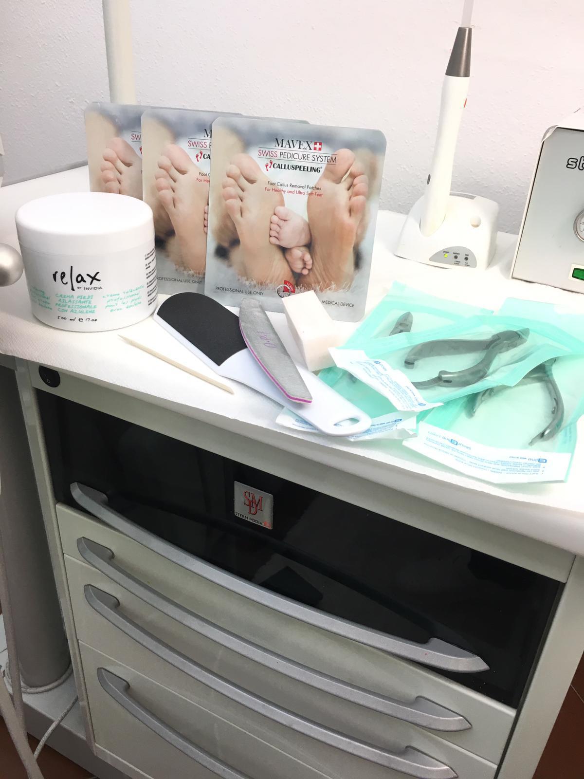 Si effettuano trattamenti estetico/curativi inerenti piedi e mani e le loro rispettive problematiche. Si utilizzano strumenti tecnologici e all’avanguardia. Si applicano lamine al titanio che vengono fissate alla base dell’unghia incarnita (onicocriptosi) tramite resina odontoiatrica. Questo trattamento è in grado di ripristinare la naturale curvatura e crescita dell’unghia, portandola alla guarigione. La metodologia non arreca dolore ed è utilizzata dal centro estetico Silvana già da tantissimi anni. Attrezzatura podologica con uso di trapano ad acqua.